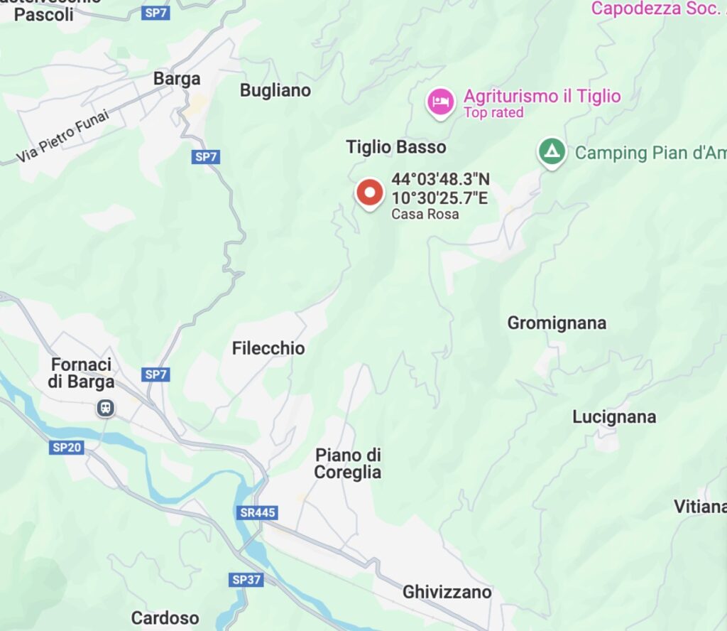 Our official address is: Casa Rosa, Colle di Tiglio 4, Tiglio, Barga 55050 LU