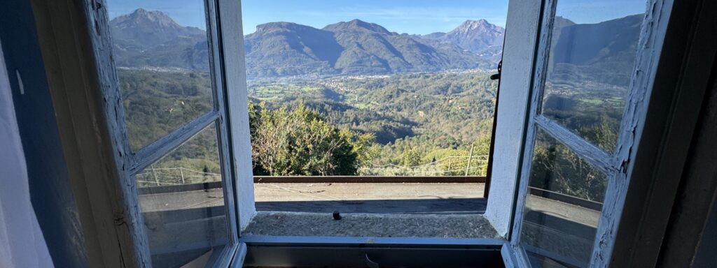 We’re remote but well situated: an hour and 15 minutes from Pisa airport, two hours from Florence by car, three-ish hours by car from Milan. And there is a reasonably frequent train from Pisa to Fornacci de Barga, the small town at the foot of our hill. Then there is ‘the last mile’ = the climb up the hill from Fornacci, into the mountains and Tiglio Basso, and our own little dirt road.